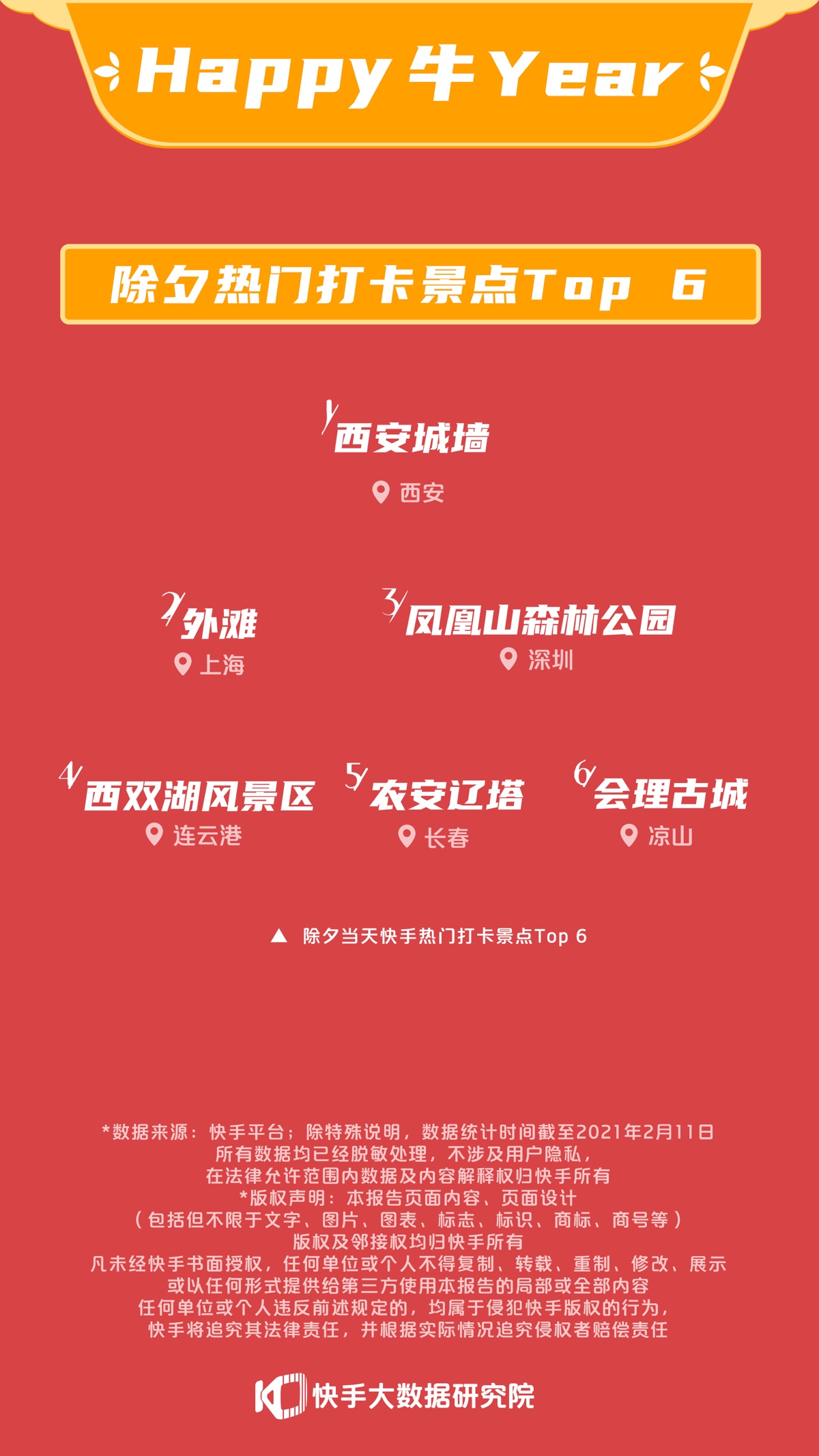 異鄉人的年夜飯也有新意,快手匯聚各派名廚,手把手用短視頻菜譜教大家做家鄉年味,八大菜系應有盡有。快手魔法表情也為“云團圓”增添趣味,除夕當天最受歡迎的魔表是“牛氣挑戰”,快手作品播放量達2.4億。此外,“云聚全家福”、“神仙拜年”等也是快手的熱門新年魔法表情?!熬偷剡^年”也帶火當地旅游,西安城墻、上海外灘、深圳鳳凰山森林公園、連云港西雙湖風景區、長春農安遼塔、涼山會理古城成為快手除夕當天的熱門打卡景點Top 6。