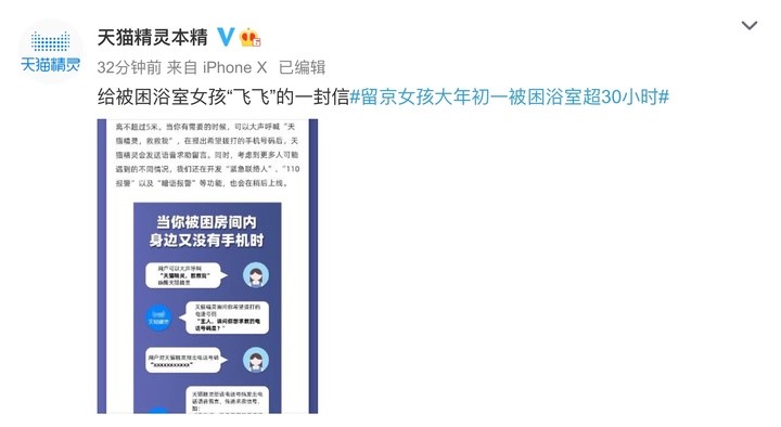 飛飛的遭遇也引起了社會大眾對于被困房間時如何自救的思考。 昨日,飛飛在今日頭條認(rèn)證賬號中發(fā)表了補(bǔ)充說明,提到“天貓精靈沒辦法撥打110功能(蘋果系統(tǒng)),安卓系統(tǒng)可以綁定自己的通訊錄,關(guān)鍵時刻可以起到很大作用。”