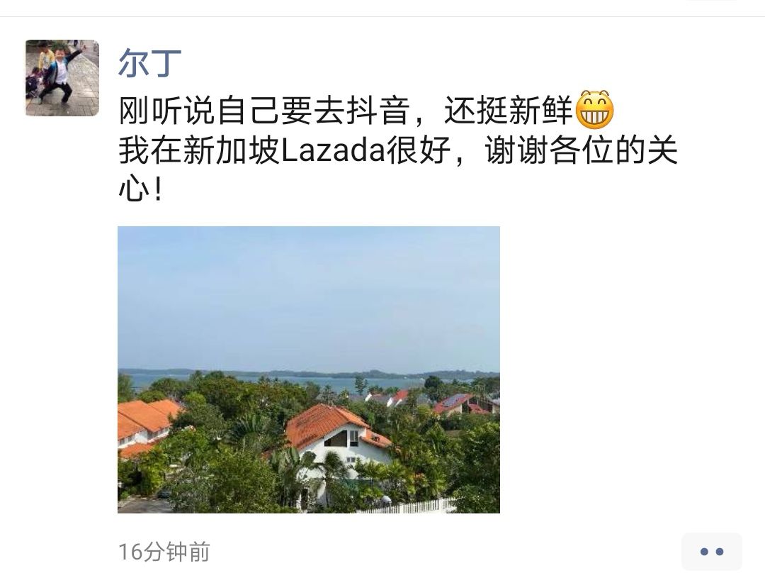 隨后,爾丁也在朋友圈表示:剛聽說自己要去抖音,還挺新鮮。我在新加坡Lazada很好,謝謝各位的關心。