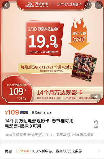 登錄蘇寧易購APP的Super會員元宵節活動頁面,可以看到,蘇寧面向Super會員,推出了109元購買萬達電影觀影卡的活動。