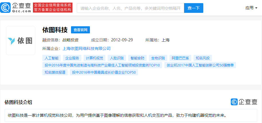 企查查APP顯示,上海依圖網絡科技有限公司是一家計算機視覺科技公司,為用戶提供基于圖像理解的信息獲取和人機交互的產品,致力于構建機器視覺的未來,公司成立于2012年。企查查顯示,依圖科技至今已完成10輪融資,交易對手包括紅杉資本、高瓴資本、真格基金、云鋒基金等。