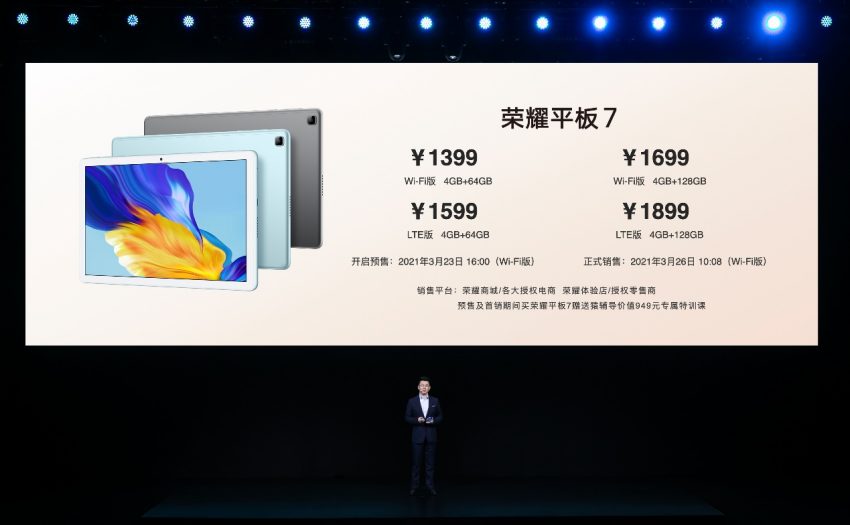 榮耀平板7 提供WiFi和LTE兩個版本,分別有4GB+64GB、4GB+128G兩個內存版本供選擇,WIFI版本售價分別為1399元和1699元,LTE版本售價分別為1599元和1899元。3月26日10:08,WiFi版將在線上線下全平臺開售,用戶可通過榮耀商城及各大授權電商平臺或前往榮耀線下體驗店、榮耀授權零售門店進行購買。