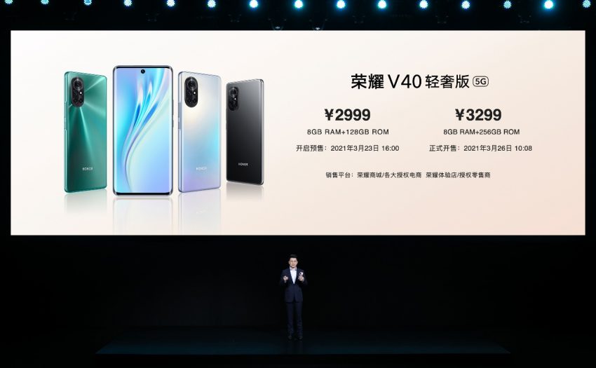 榮耀V40輕奢版擁有幻夜黑、藍水翡翠和鈦空銀三種配色,提供8GB+128GB、8GB+256GB兩個內存版本,售價分別為2999元和3299元。3月26日10:08在線上線下全平臺開售,用戶可通過榮耀商城及各大授權電商平臺或前往榮耀線下體驗店、榮耀授權零售門店進行購買。