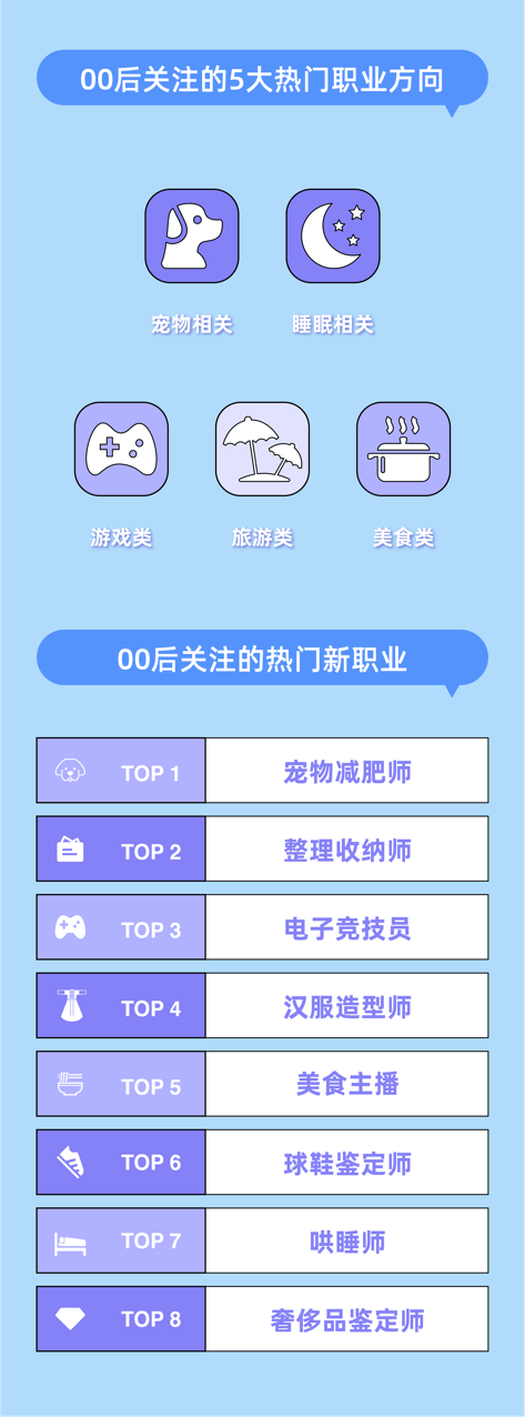 對(duì)于逐步踏入職場(chǎng)的00后來說,熱愛自由、興趣多元的特質(zhì),讓他們不甘于朝九晚五,希望打破固有的職業(yè)規(guī)劃。寵物、睡眠、游戲、旅游、美食相關(guān)的職業(yè)方向最受他們青睞。