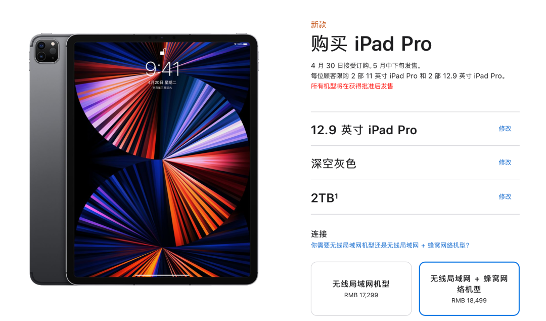 售價(jià)方面,iPad Pro售價(jià)基本與去年版本持平,11英寸售價(jià)6199元起、12.9英寸售價(jià)8499起。值得一提的是,為了滿足生產(chǎn)力需求,這一次iPad Pro最大支持2TB存儲(chǔ)空間。2TB頂配的12.9英寸iPad Pro的5G蜂窩版本售價(jià)18499元,如果再加上2399元的妙控鍵盤和969元的Apple Pencil,那么總價(jià)格高達(dá)21867元。