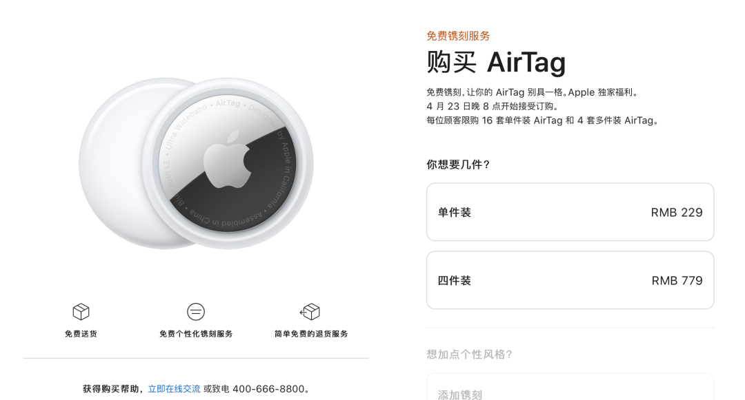 售價(jià)方面:AirTag單件裝售價(jià)299元,四件裝售價(jià)779元。