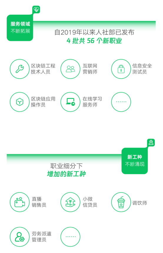 新工種不斷涌現——自2019年以來,人社部已經發布了4批共56個新職業,今年3月,人社部會又聯同國家市場監管總局、國家統計局發布了18個新職業信息,數字新生態崗位爆發態勢顯著。據報告,2020年微信生態衍生的就業機會達到3684萬個,同比增長24.4%。其中微信小程序等數字化工具在疫情中發揮了重要的促銷費、穩就業作用,小程序開發、產品、運營等工作機會超過780萬個,同比增長45.6%。2020年初新上線的微信視頻號也在視頻拍攝、直播帶貨等方面產生了超百萬個就業機會。