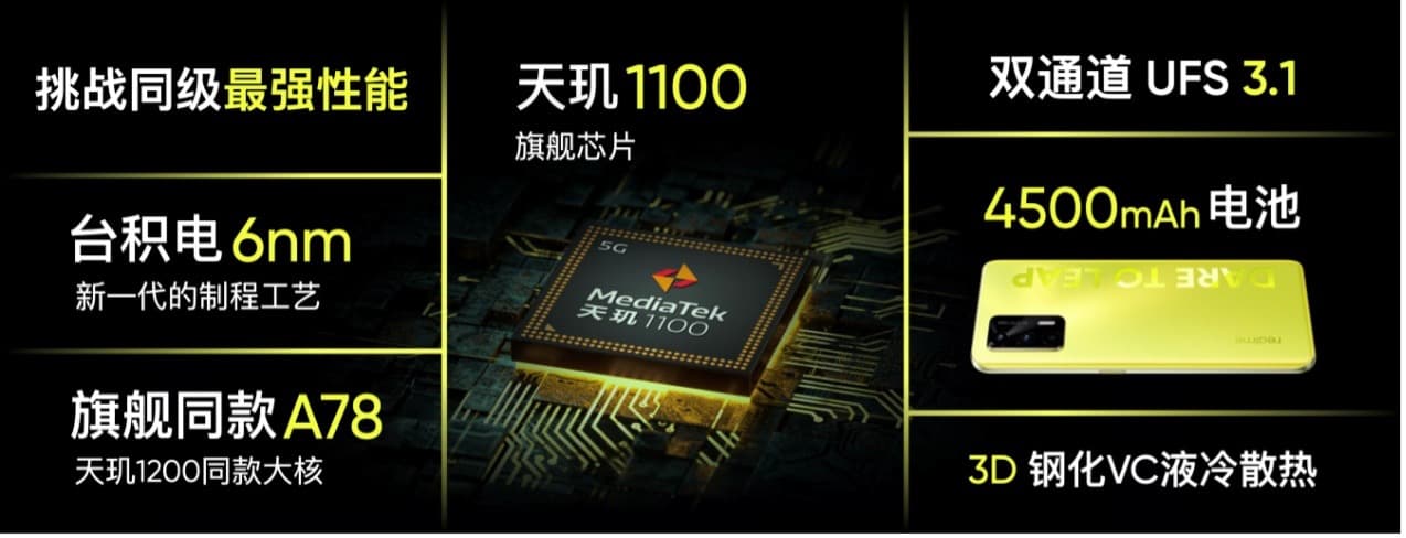 真我Q3 Pro搭載天璣1100 5G芯片,采用6nm制程工藝,搭配雙通道UFS 3.1高性能閃存、真我GT系列同款3D鋼化VC液冷散熱,相比上代產品實現了高達80%的跨代性能提升。