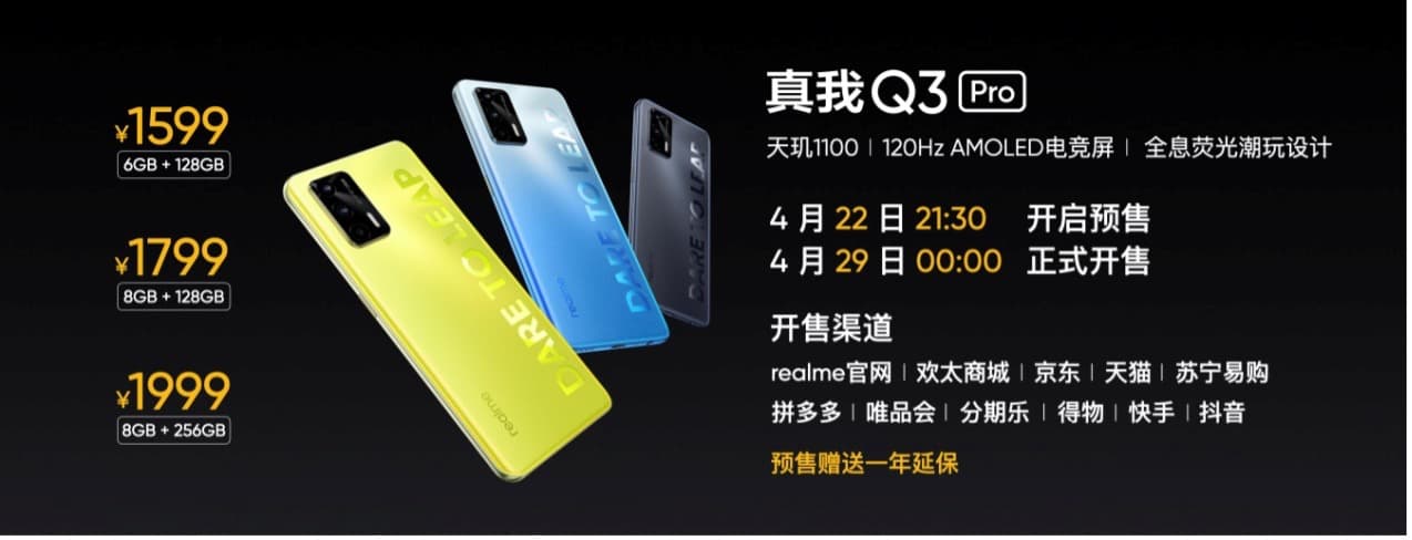 售價方面,真我Q3 Pro提供 6GB+128GB 、8GB+ 128GB 、8GB +256GB三個版本,售價分別為1599元、1799元、1999元。4月22日21:30起正式開啟預售,4月29日0點,線上全渠道正式開售。
