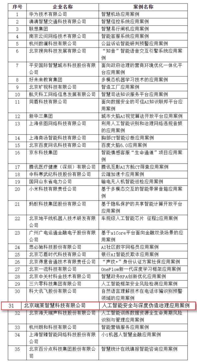 為發現和挖掘人工智能行業的最新場景和杰出企業,進一步推動我國人工智能健康穩健發展,中央網信辦信息化發展局面向人工智能社會實驗特定方向,開展了企業應用案例征集,并組織人工智能社會實驗專家組評審,最終遴選出35個典型應用案例,瑞萊智慧與華為、百度、曠視、商湯、依圖等企業共同入選其中。