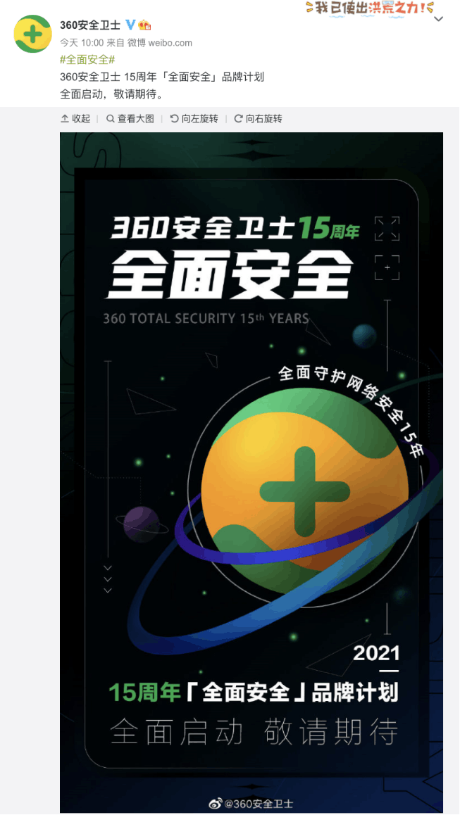 4月30日,360安全衛士官方微博宣布:正式啟動15周年“全面安全”品牌計劃。當初以免費殺毒顛覆行業格局,讓安全衛士成為網絡安全代名詞,360守護了用戶15年;今天,隨著5G來臨,云計算、大數據、人工智能等技術變革,將傳統互聯網一舉帶入全社會數字化,網絡安全也面臨著新的挑戰和威脅,360安全衛士順勢在行業中率先推出“全面安全”防護,又一次引領著整個行業的升級,擔當革新重任。