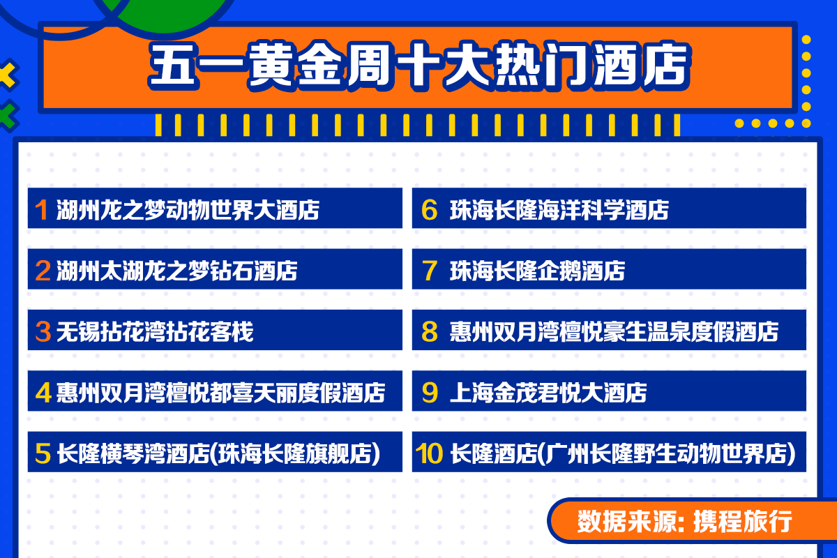 湖州龍之夢動物世界大酒店、湖州太湖龍之夢鉆石酒店、無錫拈花灣拈花客棧、惠州雙月灣檀悅都喜天麗度假酒店、長隆橫琴灣酒店(珠海長隆旗艦店)、珠海長隆海洋科學酒店、珠海長隆企鵝酒店、惠州雙月灣檀悅豪生溫泉度假酒店、上海金茂君悅大酒店、長隆酒店(廣州長隆野生動物世界店)為今年“五一”黃金周熱門酒店TOP10。