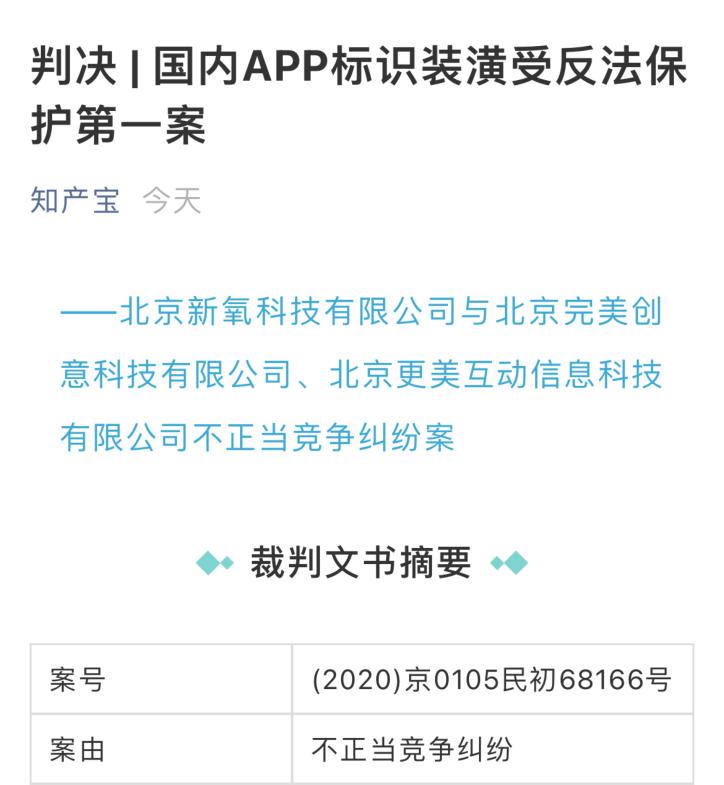 北京新氧科技有限公司(以下簡稱新氧公司)訴北京完美創意科技有限公司(以下簡稱完美公司)、北京更美互動信息科技有限公司(以下簡稱更美公司)不正當競爭糾紛案,案號(2020)京0105民初68166號,已由北京市朝陽區人民法院判定完美公司、更美公司立即停止涉案不正當競爭行為并在媒體公開聲明消除不良影響,賠償相關損失。