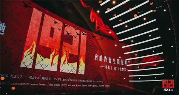 發布會結束前,北京大學學生代表獻唱《少年》,朝氣蓬勃的合唱將現場氣氛推向高潮。“我還是從前那個少年,沒有一絲絲改變”,唱響了《1921》“一百年,正青春”的主題。活動最后,北大學生代表向主創團隊贈送了由北大法語系主任董強教授題寫的活動主題“一百年,正青春”。100年前,“新青年”從北大沖破封鎖,“五四”風雷震動華夏,“一大代表”們開天辟地點燃星火,建立中國共產黨,從此沉睡的東方巨龍覺醒,赤旗終插遍祖國山河。100年后,無論是神舟飛天,嫦娥攬月,還是汶川救難,武漢逆行,中國共產黨人為人民服務的信念始終如一,面對再多險阻也從不退卻,只為實現百年來民族復興的偉大理想。不忘初心,牢記使命,電影《1921》以孜孜不倦的創新探索,力圖鼓舞更多當代年輕人以澎湃熱忱的青春力量,實現自我,貢獻家國!