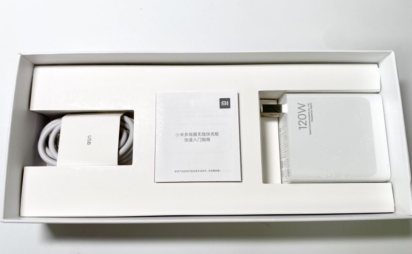 包裝內(nèi)部下層從左至右為6A充電線、說明書及保修卡、小米120W的充電頭。值得一提的是,僅這個(gè)小米120W閃充充電頭+數(shù)據(jù)線,目前在小米商城售價(jià)為249元,讓這款599元的充電板看上去更具性價(jià)比。