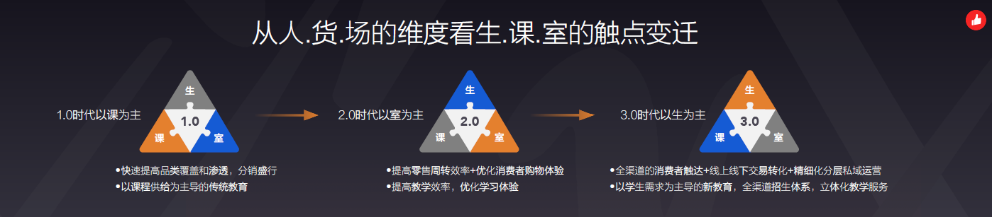 浣昉表示,從私域經(jīng)濟(jì)人、貨、場(chǎng)的維度,有贊看到了教培行業(yè)生、課、室的觸點(diǎn)變遷。其把教培行業(yè)的變遷分為3個(gè)階段:以課程為主的傳統(tǒng)教育時(shí)代;以教學(xué)場(chǎng)景-教室為主的2.0時(shí)代,諸如在線教育的、雙師課堂的崛起都是圍繞著“教室”運(yùn)營(yíng)效率的提高而產(chǎn)生的;以學(xué)生為核心的新教育3.0時(shí)代,關(guān)鍵在以學(xué)生需求為核心來(lái)展開(kāi)精細(xì)化私域運(yùn)營(yíng),滿足學(xué)員學(xué)習(xí)旅程的各種需求。