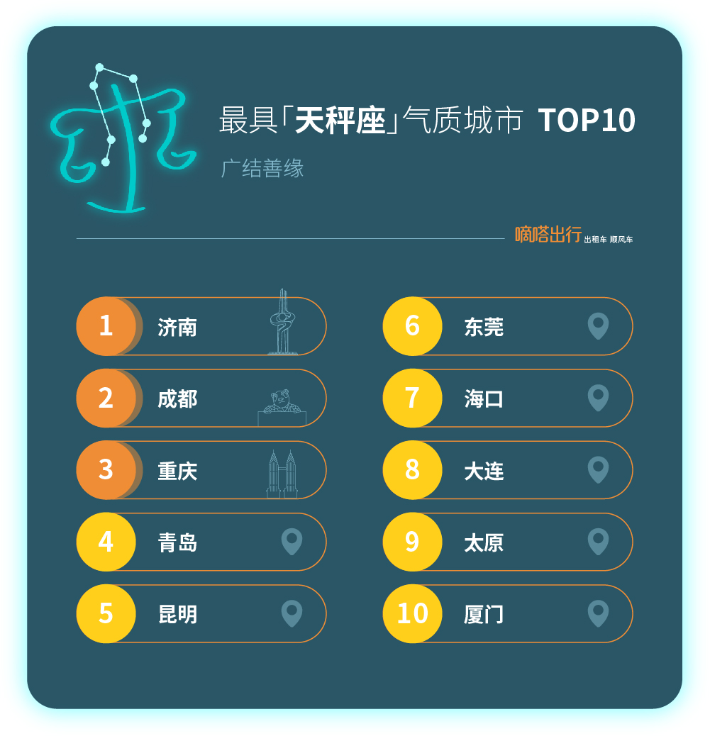 天秤座追求和平和諧,溝通協調能力強,反映到順風出行中,就是一趟行程可以很好平衡兩單乘客需求,和諧滿意送達。根據嘀嗒順風車大數據,在市內順風車中,車主一次行程實現拼成兩單的訂單占比最高的城市,依次為濟南、成都、重慶、青島、昆明、東莞、???、大連、太原、 廈門,其中濟南和青島均為山東省城市,充分展現了齊魯大地孔孟文化的深遠影響:禮儀之邦,以和為貴。
