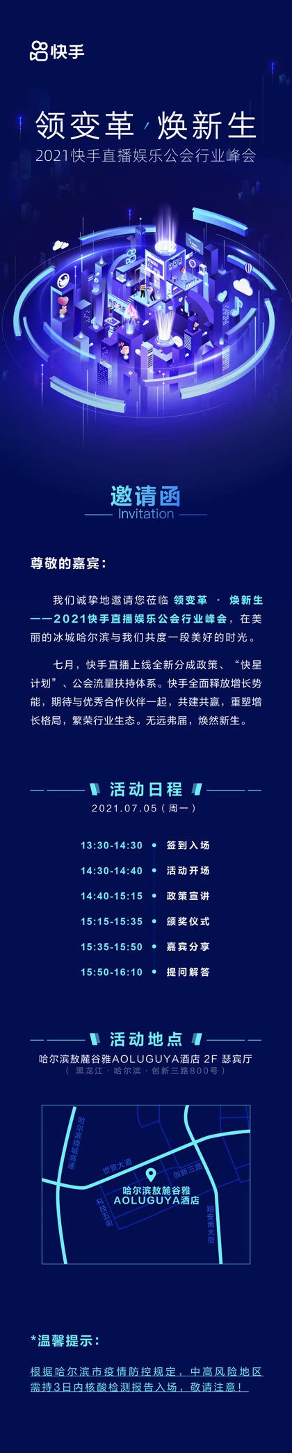 7月5日,“領變革 · 煥新生”2021快手直播娛樂公會行業(yè)峰會將來到“冰城”哈爾濱,廣邀各地直播公會參與,會上快手公會運營負責人顧北將重點解讀公會新分成政策、流量政策、產(chǎn)品功能、城市代理等核心模塊,為公會發(fā)展量身打造星級權益,并剖析娛樂直播公會市場,助力公會在快手上更好更快發(fā)展。