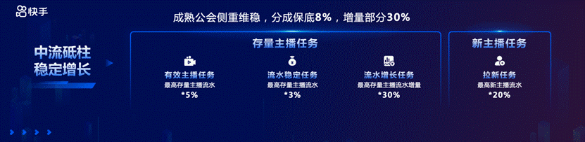 具體而言,7月公會分成政策以公會自身情況為基礎,分為三個階段,每個階段下發不同類型任務。月流水超過500萬的大型公會有權利選擇“成長任務”或者“成熟任務”:對于月流水超過500萬的大型公會來說,只要該公會當月流水無明顯跌幅,且保持一定的開播規模,公會即可拿到最高8%可預期的收益;對表現積極的公會,快手最高還將給予其增量部分流水30%的額外返點。