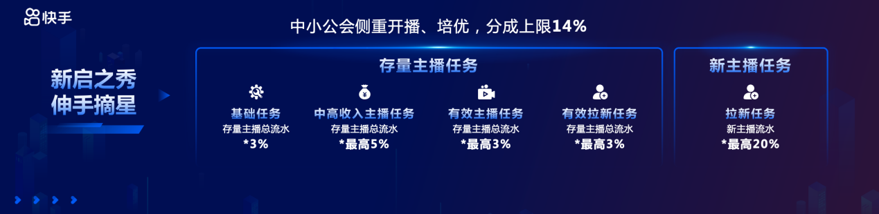 對于月流水小于等于50萬的小型公會來說,公會完成“新手任務”,就可在存量主播身上最高可獲14%的結算比例,同時原有的新主播20%額外返點政策也會保留。