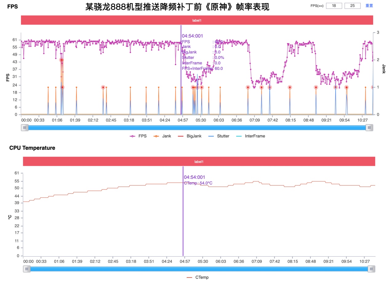 測試結果表明,在更新OTA之前,當CPU溫度達到54°C時,才會發生降頻,幀率從60fps掉到30fps左右;當CPU溫度重新回到50°C時,幀率從30fps重新提升到60fps。
