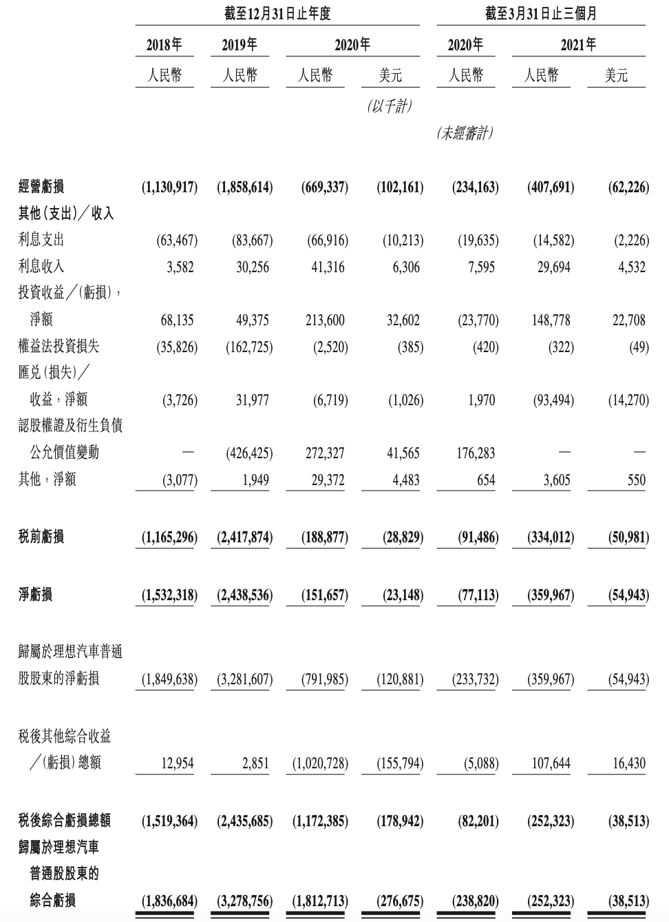 招股書顯示,理想汽車自2019年至今依舊處于虧損狀態,2019和2020年總收入分別約為2.84億、94.57億元,歸屬普通股東的凈虧損分別為32.82億元、7.92億元。2021年前三個月總收入35.75億元,雖然相比去年同期8.52億元大漲319.8%,但并沒有為理想汽車收窄虧損,歸屬普通股東的凈虧損3.60億元,虧損相比去年同期2.34億元擴大54%。