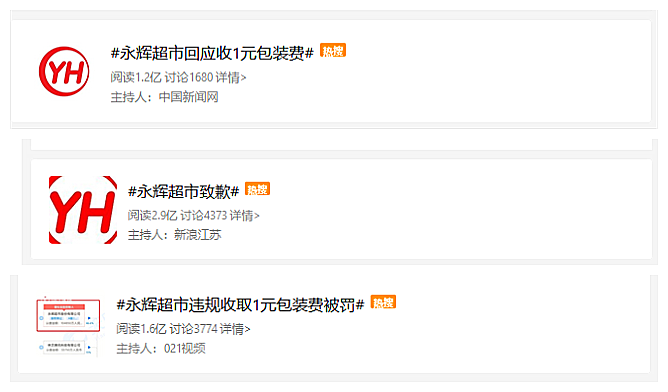 近日,#永輝超市違規(guī)收取1元包裝費(fèi)被罰#、#永輝超市回應(yīng)收1元包裝費(fèi)#等多個(gè)話題登上微博熱搜。值得注意的是,永輝超市在收取包裝費(fèi)前并未取得消費(fèi)者同意。