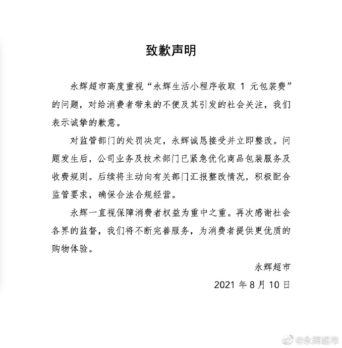 聲明中,永輝超市表示,其將高度重視“永輝生活小程序收取1元包裝費(fèi)”的問(wèn)題,同時(shí)就此事給廣大消費(fèi)者帶來(lái)的不便及此事所引發(fā)的各方社會(huì)關(guān)注表示真誠(chéng)地歉意。談到監(jiān)管部門的處罰決定,永輝超市表示:誠(chéng)懇接受并立即整改。“問(wèn)題發(fā)生后,公司業(yè)務(wù)及技術(shù)部門已緊急優(yōu)化商品包裝服務(wù)及收費(fèi)規(guī)則。后續(xù)將主動(dòng)向有關(guān)部門匯報(bào)整改情況,積極配合監(jiān)管要求,確保合法合規(guī)經(jīng)營(yíng)。”