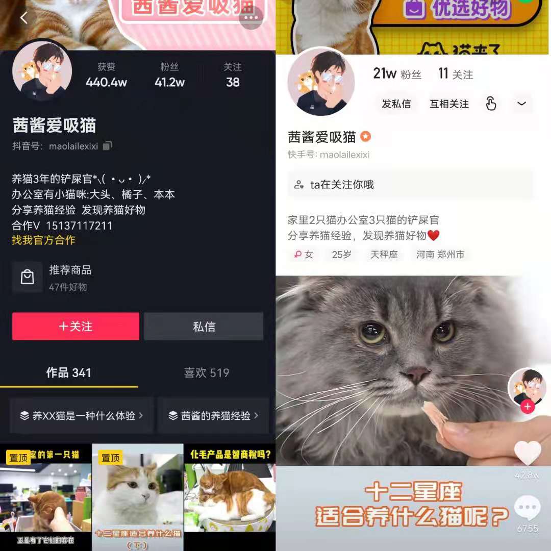 簡(jiǎn)介:茜醬愛吸貓的定位是一個(gè)在辦公室養(yǎng)了多只貓的女生,分享養(yǎng)貓知識(shí)和貓行為學(xué),累積獲贊440.4w,累積粉絲數(shù)41.2w目前賬號(hào)在抖音和快手的雙平臺(tái)粉絲量達(dá)到了62.2萬(wàn)。