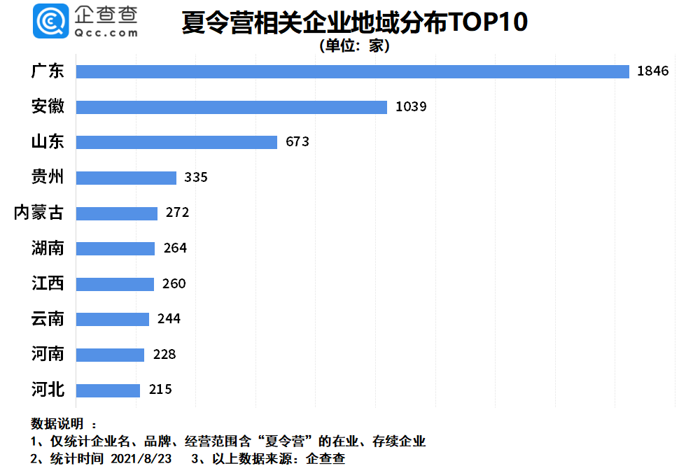 企查查數據顯示,目前我國現存“夏令營”相關企業共0.7萬家。近十年注冊量呈增長趨勢,其中2019年注冊量最多,為2400余家。今年上半年共注冊了430家夏令營相關企業,同比下跌了42.1%。從地域分布來看,廣東、安徽、山東分別以1846家、1039家、673家家排名省份前三。