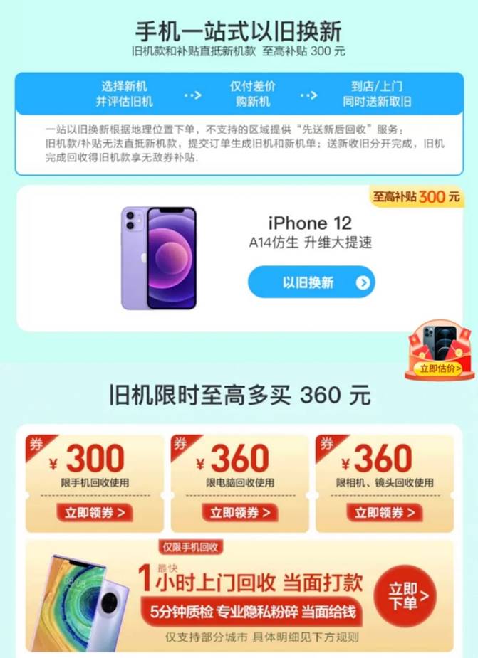 據了解,蘇寧易購推出蘋果以舊換新額外補貼服務,Apple產品以舊換新全場至高補貼360元。針對手機產品,以舊換新更是可以選擇“一站式換新”、“先送新后收舊”等服務,最快1小時上門回收。