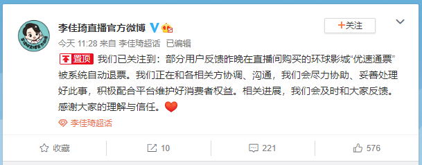 速途網9月14日消息:今日上午,李佳琦直播官方微博就“北京環球影城優速通票被自動退票”一事發布回應稱,部分用戶反饋昨晚在直播間購買的環球影城“優速通票”被系統自動退票,正在和各相關方協調、溝通,會盡力協助、妥善處理好此事。