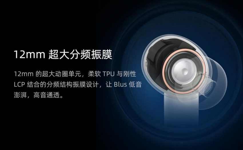 魅藍 Blus 主動降噪耳機采用了一塊 12mm 超大分頻振膜,為魅藍 Blus 主動降噪耳機提供了澎湃的低音表現,同時由柔軟 TPU 與剛性 LCP 結合而成的分頻結構的加入,讓它也有著純澈的高頻音質表現。