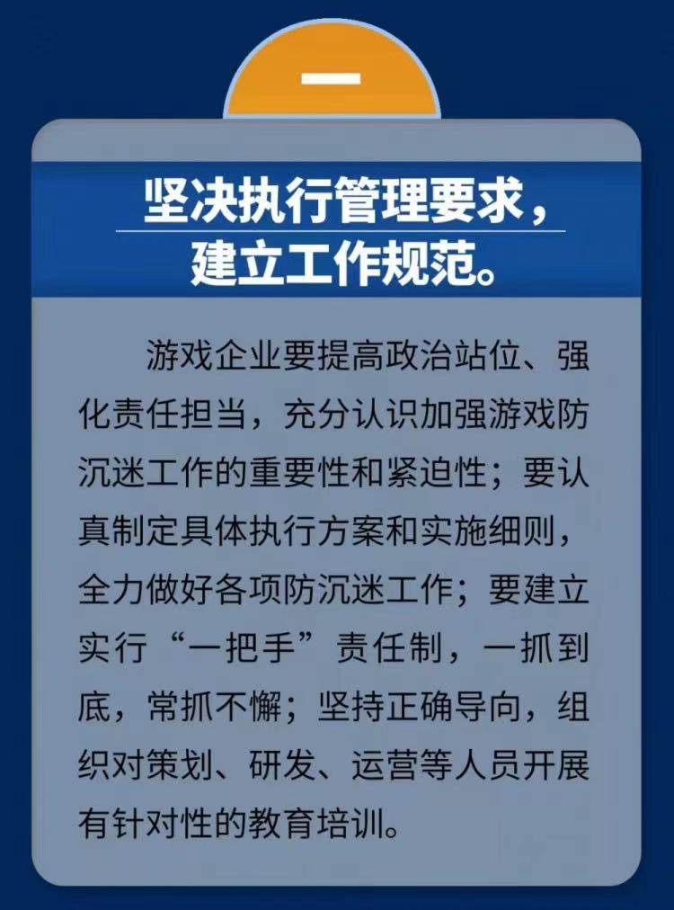 1、堅決執(zhí)行管理要求,建立工作規(guī)范。游戲企業(yè)要提高政治站位、強化責任擔當,充分認識加強游戲防沉迷工作的重要性和緊迫性;要認真制定具體執(zhí)行方案和實施細則,全力做好各項防沉迷工作;要建立實行“一把手”責任制,一抓到底,常抓不懈;堅持正確導向,組織對策劃、研發(fā)、運營等人員開展有針對性的教育培訓。