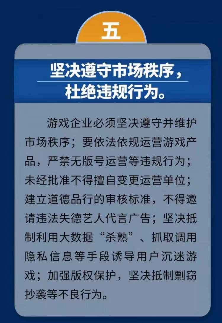 5、堅決遵守市場秩序,杜絕違規(guī)行為。游戲企業(yè)必須堅決遵守并維護市場秩序;要依法依規(guī)運營游戲產(chǎn)品,嚴禁無版號運營等違規(guī)行為;未經(jīng)批準不得擅自變更運營單位;建立道德品行的審核標準,不得邀請違法失德藝人代言廣告;堅決抵制利用大數(shù)據(jù)“殺熟”、抓取調(diào)用隱私信息等手段誘導用戶沉迷游戲;加強版權(quán)保護,堅決抵制剽竊抄襲等不良行為。