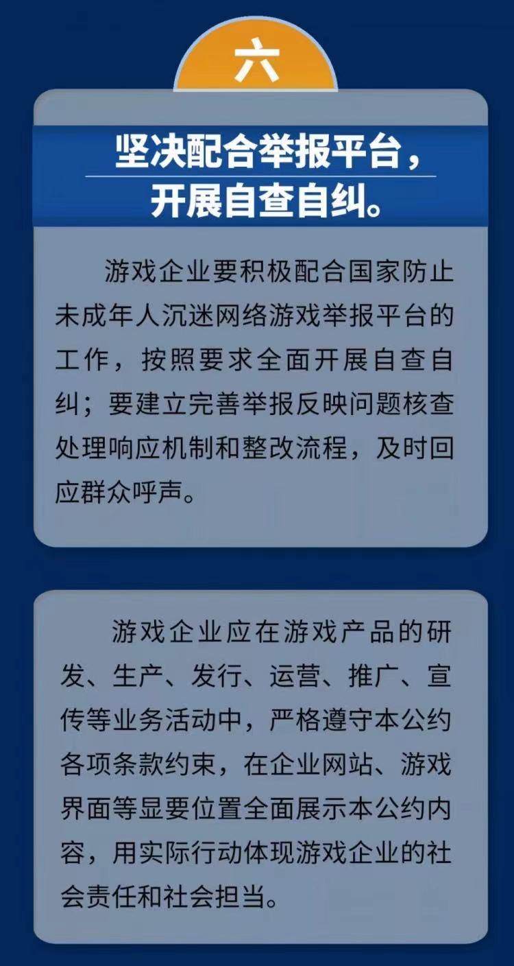 6、堅決配合舉報平臺,開展自查自糾。游戲企業(yè)要積極配合國家防止未成年人沉迷網(wǎng)絡(luò)游戲舉報平臺的工作,按照要求全面開展自查自糾;要建立完善舉報反映問題核查處理響應(yīng)機制和整改流程,及時回應(yīng)群眾呼聲。