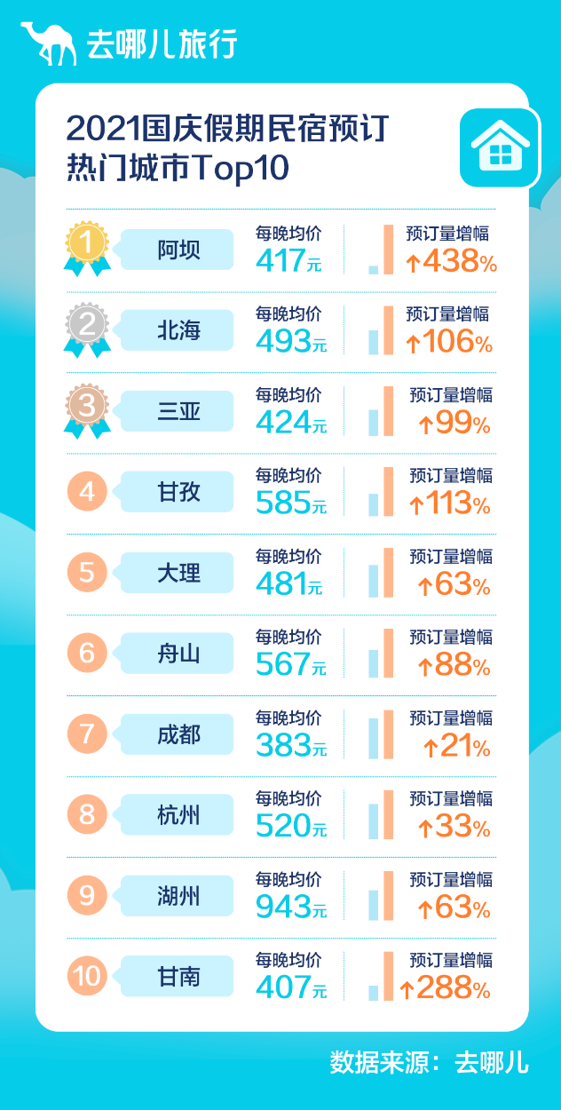 去哪兒數據顯示,國慶假期民宿預訂熱門城市Top10中,四川和浙江各有三個城市上榜,其中四川的阿壩,民宿預訂量和增幅均領跑全國。而浙江的舟山、杭州和湖州的上榜,則充分體現了長三角城市群游客“內循環式度假”的熱情。