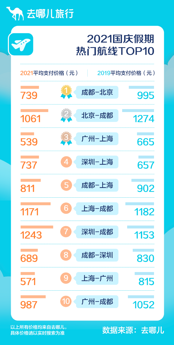 去哪兒數據顯示,成都-北京、北京-海口、長沙-西寧、貴陽-北京、上海-廣州等多條熱門探親、旅游航線的機票平均支付價格比2019年國慶假期便宜三成左右。成都-北京是去哪兒平臺國慶假期預訂熱度最高的航線,平均支付價格僅為739元,預訂熱度比2019年同期增長1.3倍、價格卻便宜了256元。