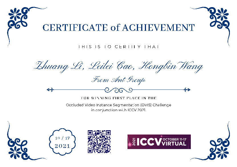 近期,國際計算機視覺大會(ICCV)官方網站陸續公布了ICCV2021計算機視覺挑戰賽成績,來自螞蟻保險科技的選手摘得“遮擋視頻實例分割”挑戰賽的第一名。名列前茅的還有美國卡耐基梅隆大學和德國亞琛工業大學等先進研究機構。