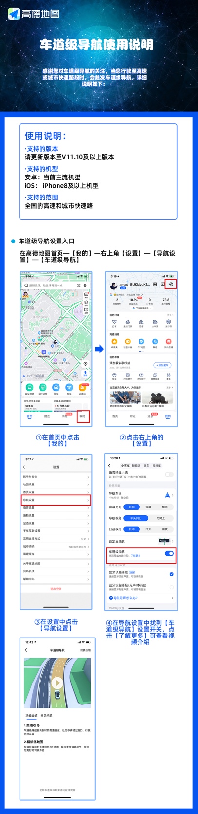 而高德車道級導航高清版的推出,則是為了盡可能地克服了當前支持高精度定位的硬件及道路數量較少的制約,支持市面上大部分主流的iPhone(iPhone 8及以上)和安卓手機機型,讓更多用戶即便在定位精度有限的條件下,也能夠體驗到高精細的導航指引服務。