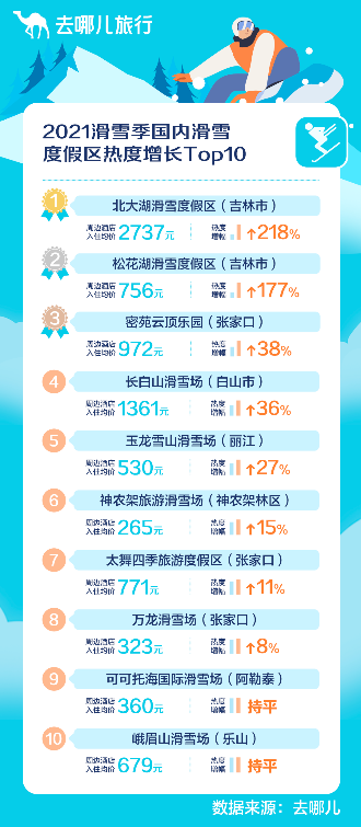 去哪兒數據顯示,北大湖滑雪度假區成為2021年滑雪季熱度增幅最高的滑雪度假區,與2019年同期相比增長218%,周邊相關酒店入住平均價格達到2737元/晚。入住均價來看,長白山滑雪場排在第二,周邊酒店入住平均價格達到1361元/晚。
