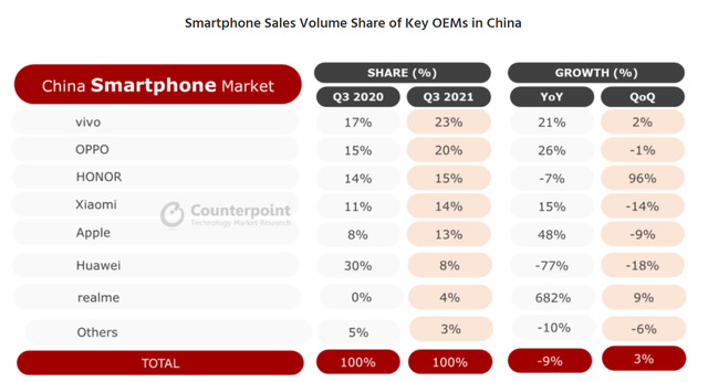 根據市場機構Conterpoint數據顯示,今年第三季度中國智能手機市場,華為手機市場占有率從上一年的30%,大幅跌落至8%,銷量相比去年同期降低了77%。