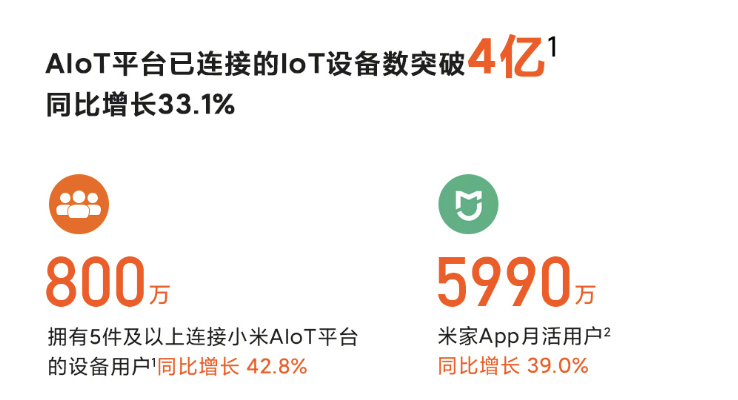 “手機x AIoT”作為小米的核心戰略,AIoT作為圍繞手機而生,同時反哺手機生態的業務。從財報來看,也是小米手機之外的重要增長引擎。根據今天發布的小米2021第三季度財報顯示,其AIoT平臺已連接的IoT設備數突破4億,擁有5件及以上連接小米AIoT平臺的設備(不包含智能手機及筆記本電腦)用戶達到800萬,米家APP月活用戶數超過了5990萬。