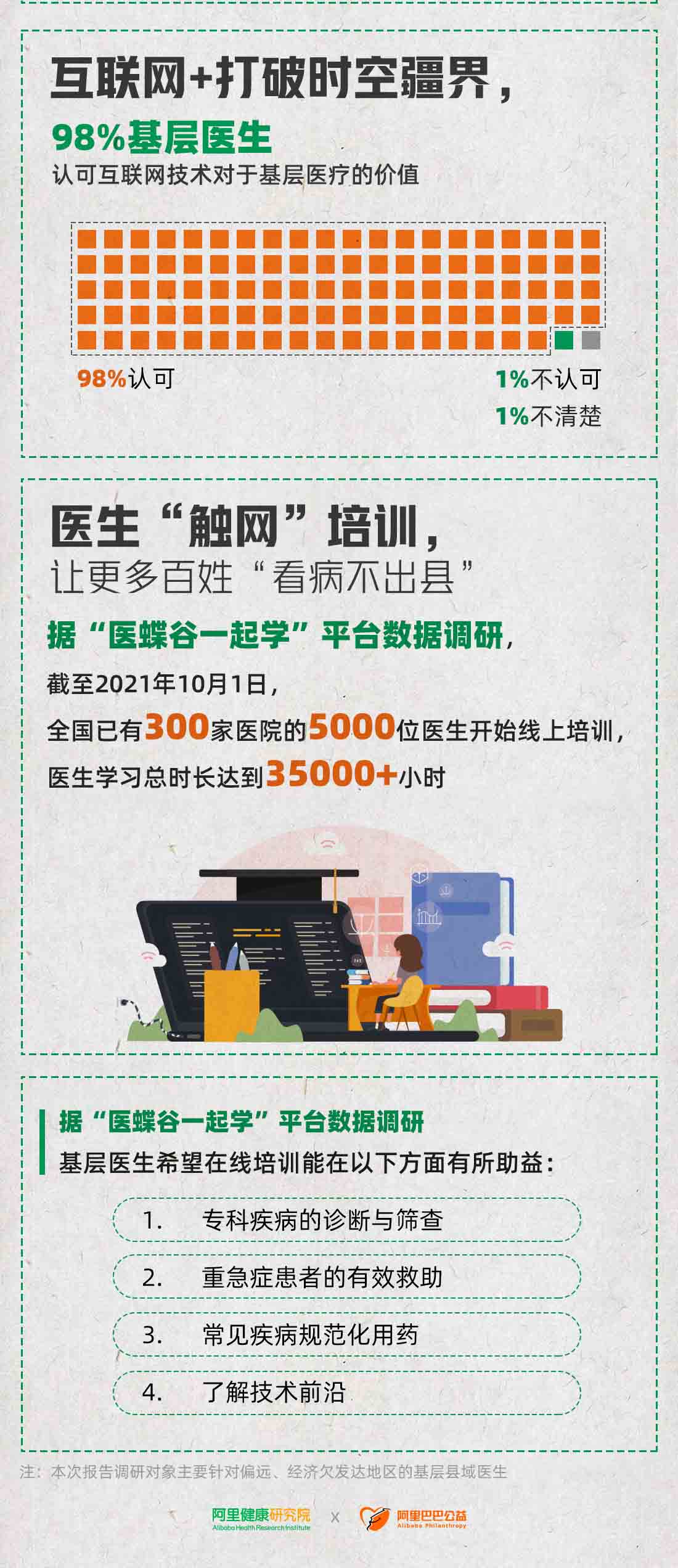 這份名為《基層醫(yī)生互聯(lián)網(wǎng)調(diào)研報告》基于對阿里健康“醫(yī)蝶谷一起學(xué)”公益學(xué)習(xí)平臺上基層醫(yī)生的網(wǎng)絡(luò)調(diào)研。平臺上的醫(yī)生多來自于偏遠地區(qū)的縣醫(yī)院,他們的工作,關(guān)乎國家“大病不出縣”體系的完善。