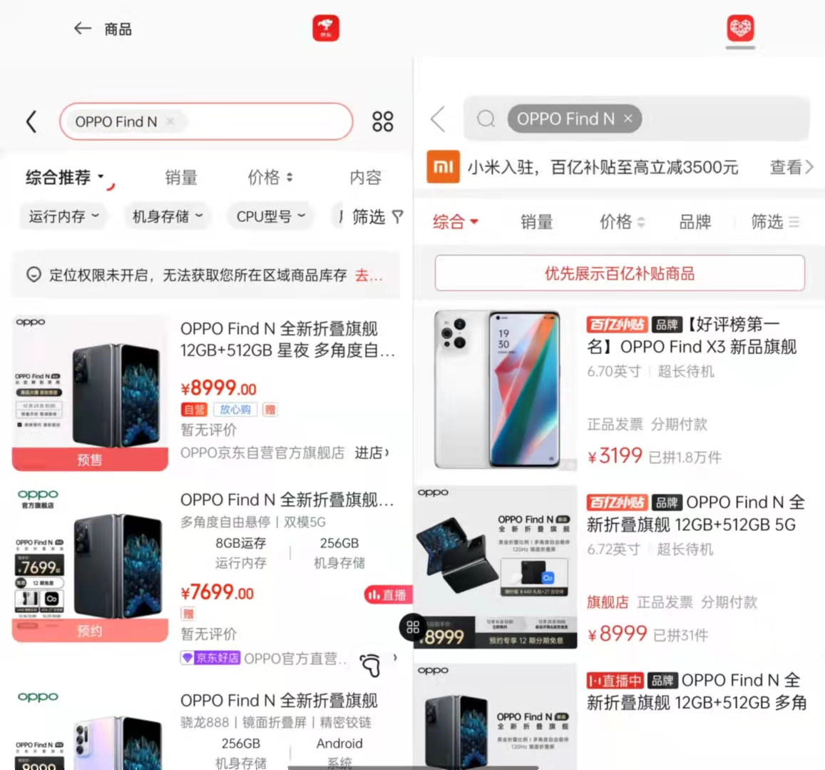 除此之外,為了更好利用這塊大屏,OPPO Find N還帶來了“一鍵多搜”功能,支持商品、機票、酒店、信息四類內容搜索。例如買東西、訂酒店時可以同時顯示三個平臺的價格,幫助用戶快捷比價。