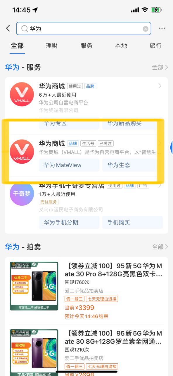 以華為商城為例,在生活號里,用戶可以看到華為商城近期發布的動態、專欄消息;能通過“自助服務”使用相關服務,還能直接跳轉商家小程序,進行下單購買或其他后續操作。除了直接在“生活頻道”里刷到相關信息,用戶還可在支付寶App首頁搜索“華為”,從搜索結果頁進入華為商城的生活號。