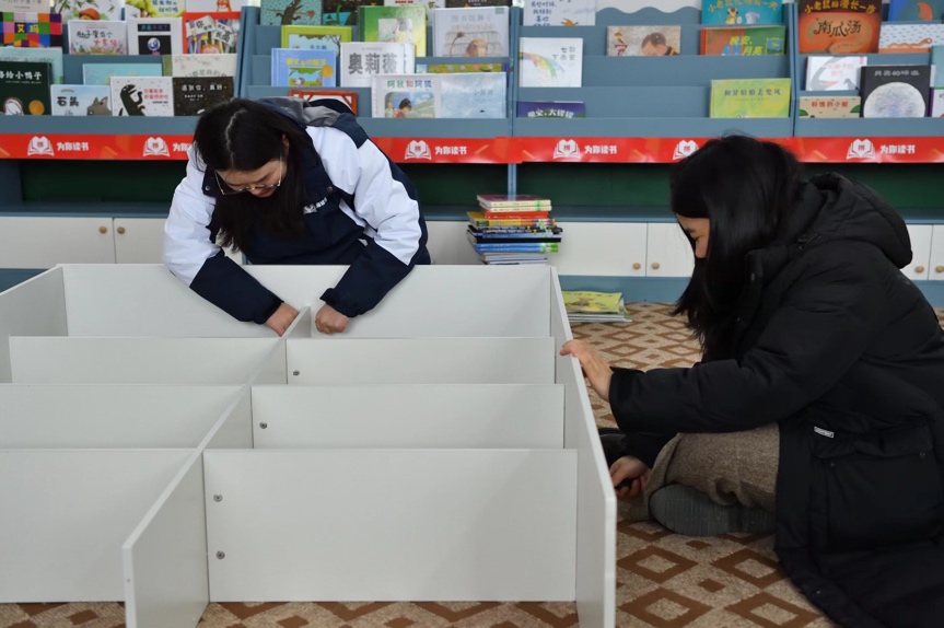 ▲在閱覽室里,本次公益捐贈活動的工作人員正在緊張搭設剛剛快遞過來的書架。攝影:陳逸航