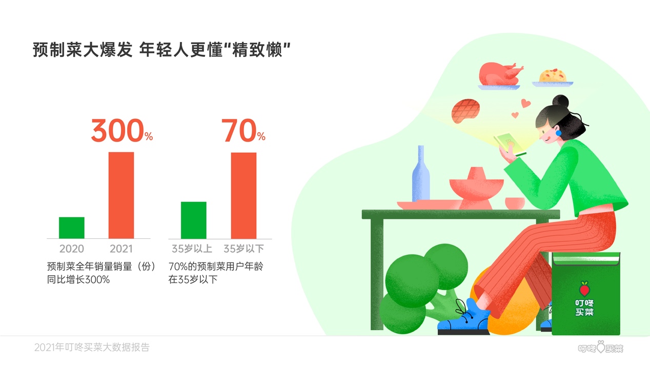 叮咚買菜數據顯示,2021年,叮咚買菜預制菜全線產品銷量(單位:份)同比去年增長300%,包含預制菜的訂單在整體訂單的滲透率已經超過40%。另外,在購買預制菜的用戶中,超過70%的用戶年齡在35以下。在年輕人普遍高壓的工作和生活狀態下,高質量的預制菜正在解決這部分用戶對菜品品質不高、不健康的擔憂。
