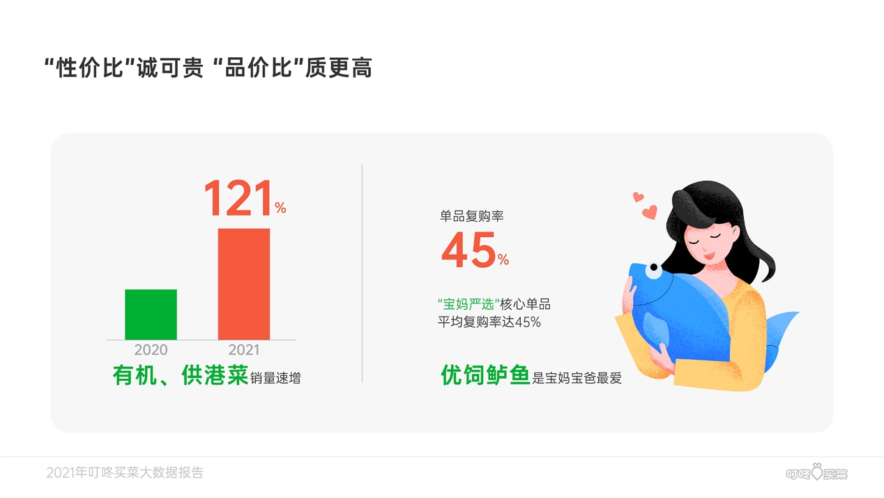 就在去年,叮咚買菜還建立了“寶媽嚴選”專題,提出了更嚴、門檻更高的產品準入標準,為寶媽寶爸們和注重安全健康的群體,精選出讓人可以“閉著眼睛”購買的高標準食材。目前,寶媽嚴選的商品平均復購率超45%,筆單價最高能達到91元。