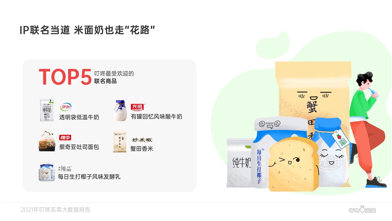消費者對品牌信任度的提升,也體現在了聯名商品的增多,如今米面糧乳等民生品類也不乏有趣的聯名現象,過去一年,人們最喜歡的5款商品聯名分別是,叮咚買菜和伊利聯名的低溫牛奶、光明有罐回憶風味酸牛奶、與桃李聯手做的藜奇亞吐司面包、好米販的蟹田香米和“網紅”每日生打椰子風味發酵乳。